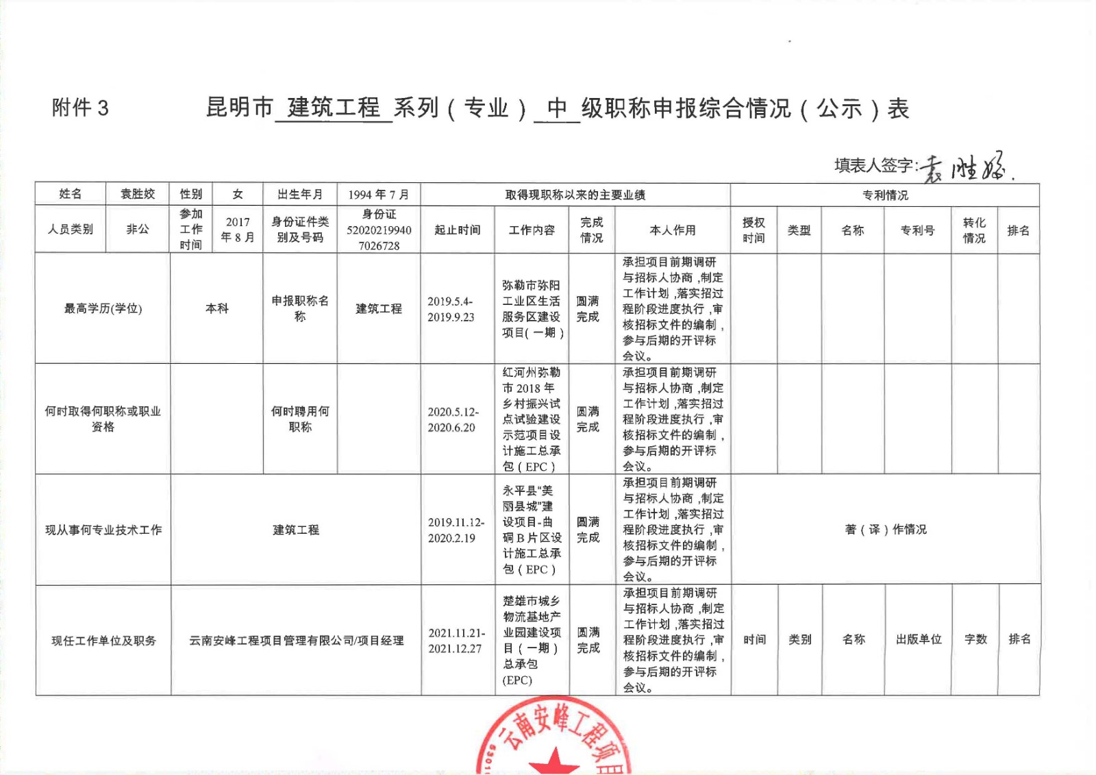 關(guān)于云南安峰工程項(xiàng)目管理有限公司員工袁勝姣申報(bào)建筑工程系列(專業(yè))中級職稱情況公示