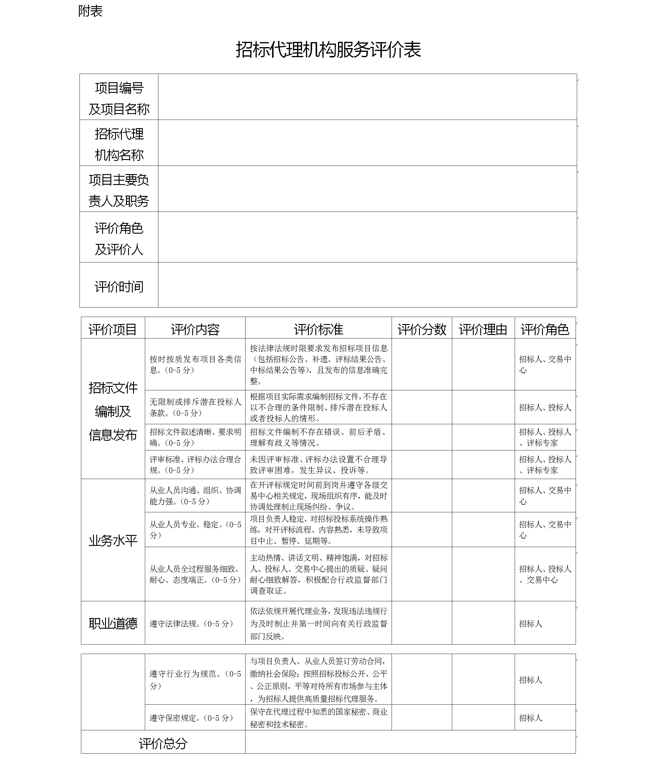 附表:招標(biāo)代理機(jī)構(gòu)服務(wù)評價(jià)表