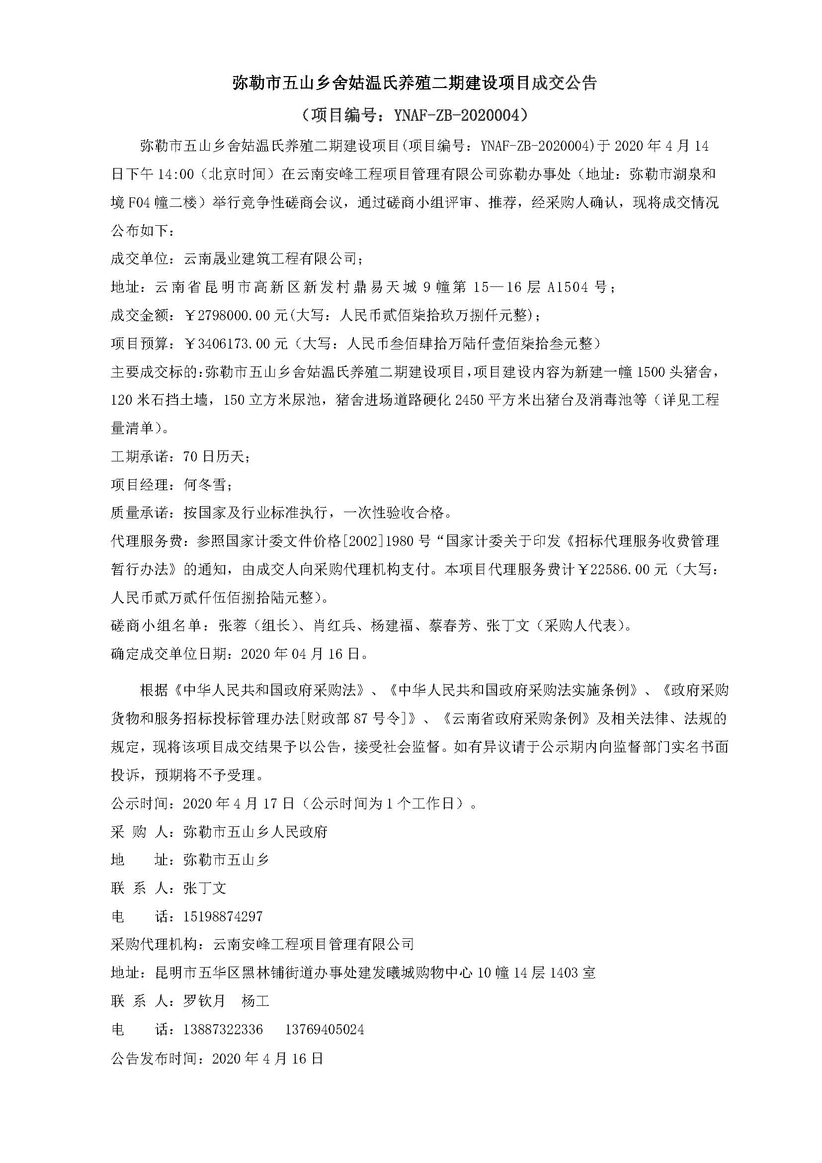 彌勒市五山鄉(xiāng)舍姑溫氏養(yǎng)殖二期建設(shè)項(xiàng)目成交公告