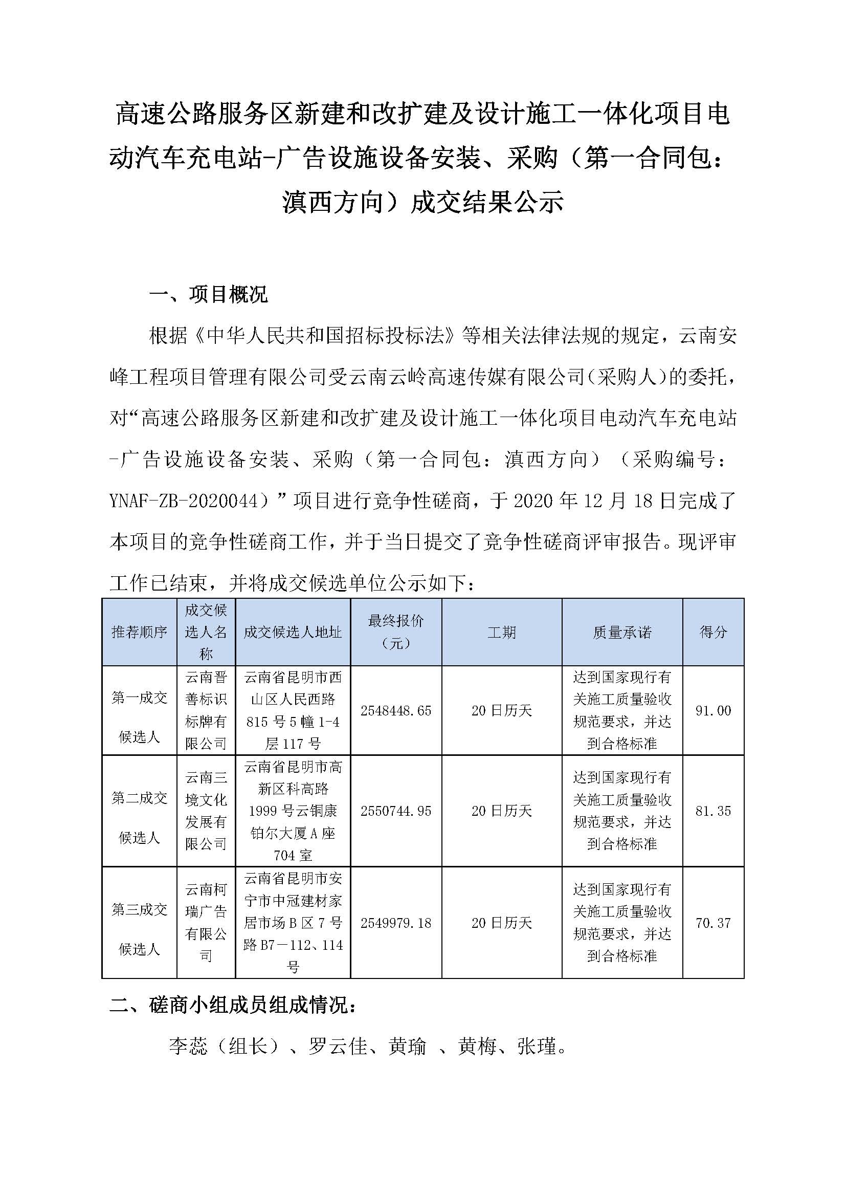 高速公路服務(wù)區(qū)新建和改擴(kuò)建及設(shè)計施工一體化項目電動汽車充電站-廣告設(shè)施設(shè)備安裝、采購(第一合同包:滇西方向)成交結(jié)果公示