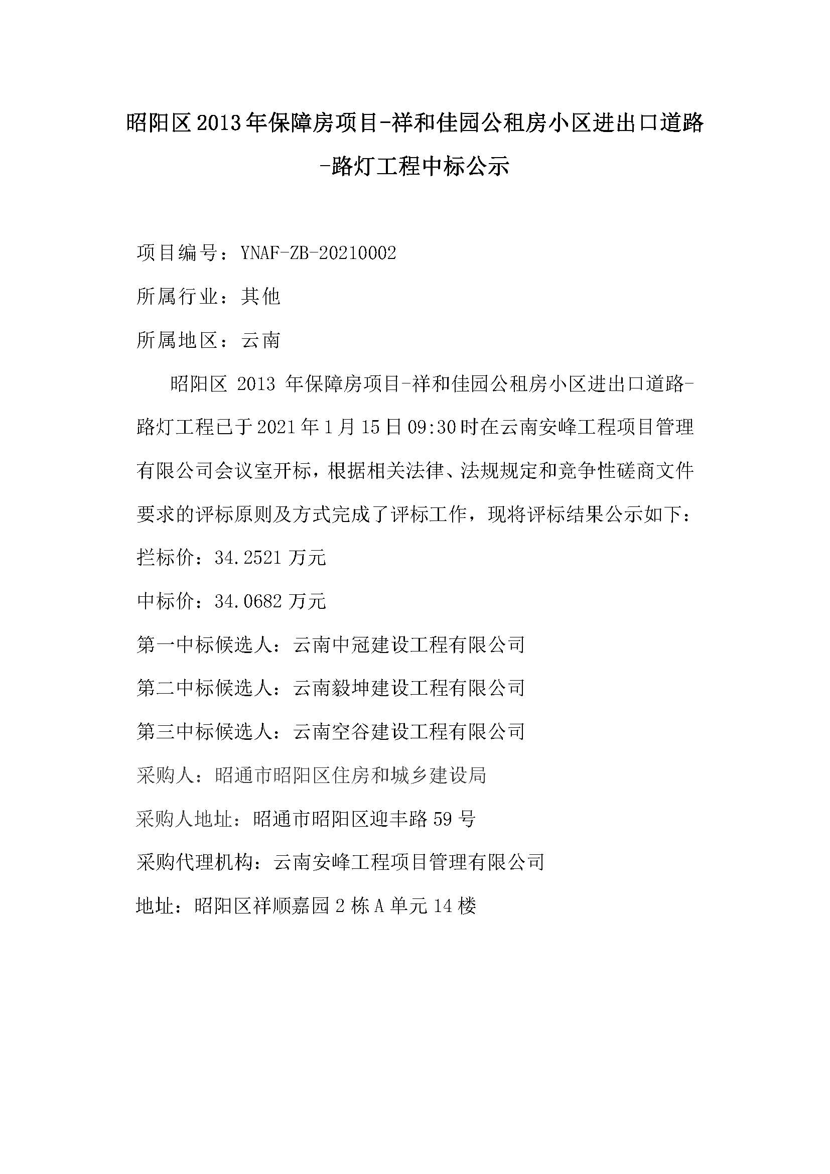 昭陽區(qū)2013年保障房項目-祥和佳園公租房小區(qū)進出口道路-路燈工程中標(biāo)公示