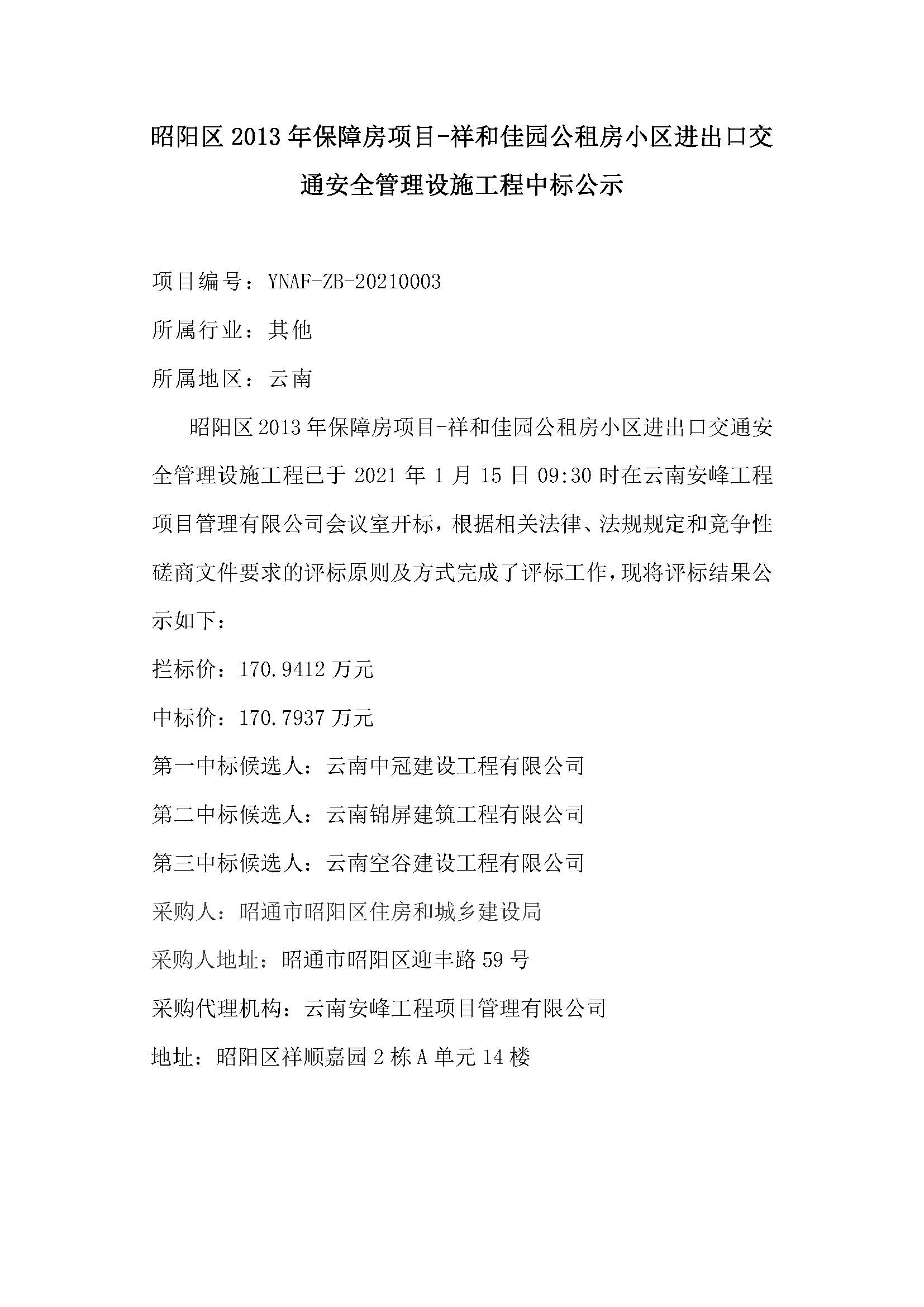 昭陽區(qū)2013年保障房項目-祥和佳園公租房小區(qū)進出口交通安全管理設施工程中標公示