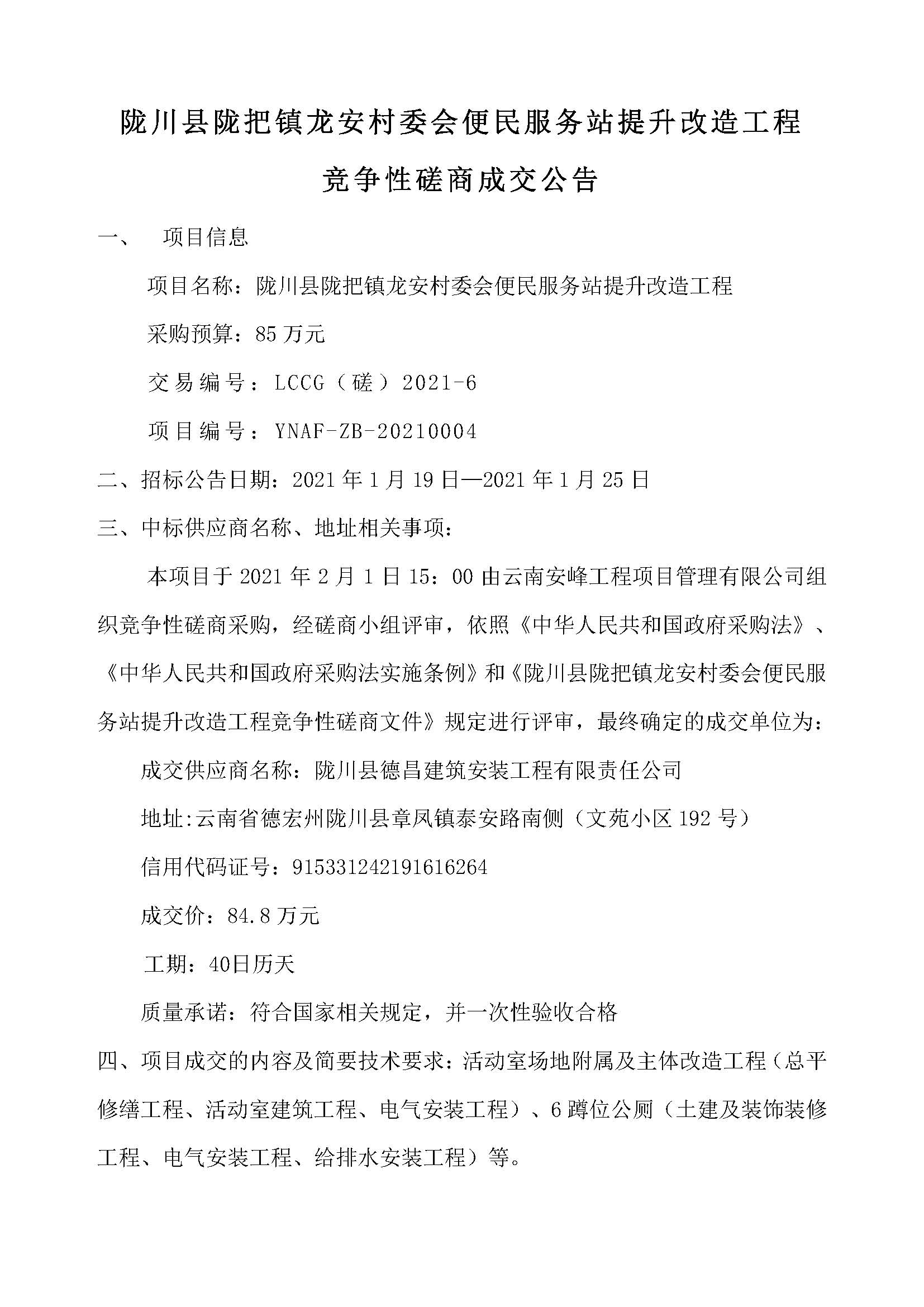 隴川縣隴把鎮(zhèn)龍安村委會便民服務(wù)站提升改造工程 競爭性磋商成交公告