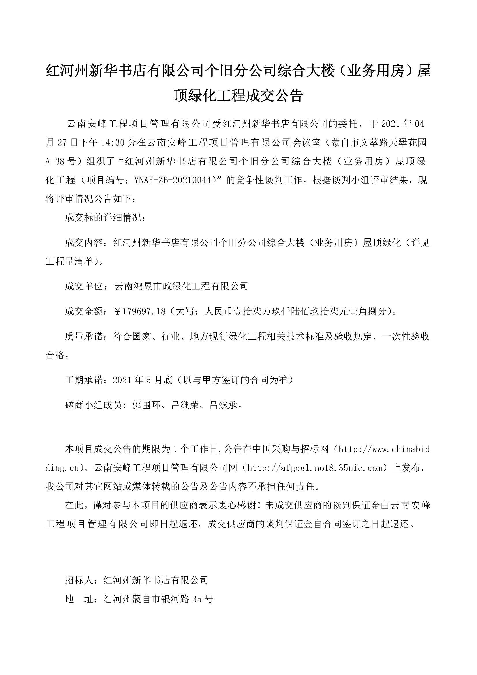 紅河州新華書店有限公司個(gè)舊分公司綜合大樓(業(yè)務(wù)用房)屋頂綠化工程成交公告