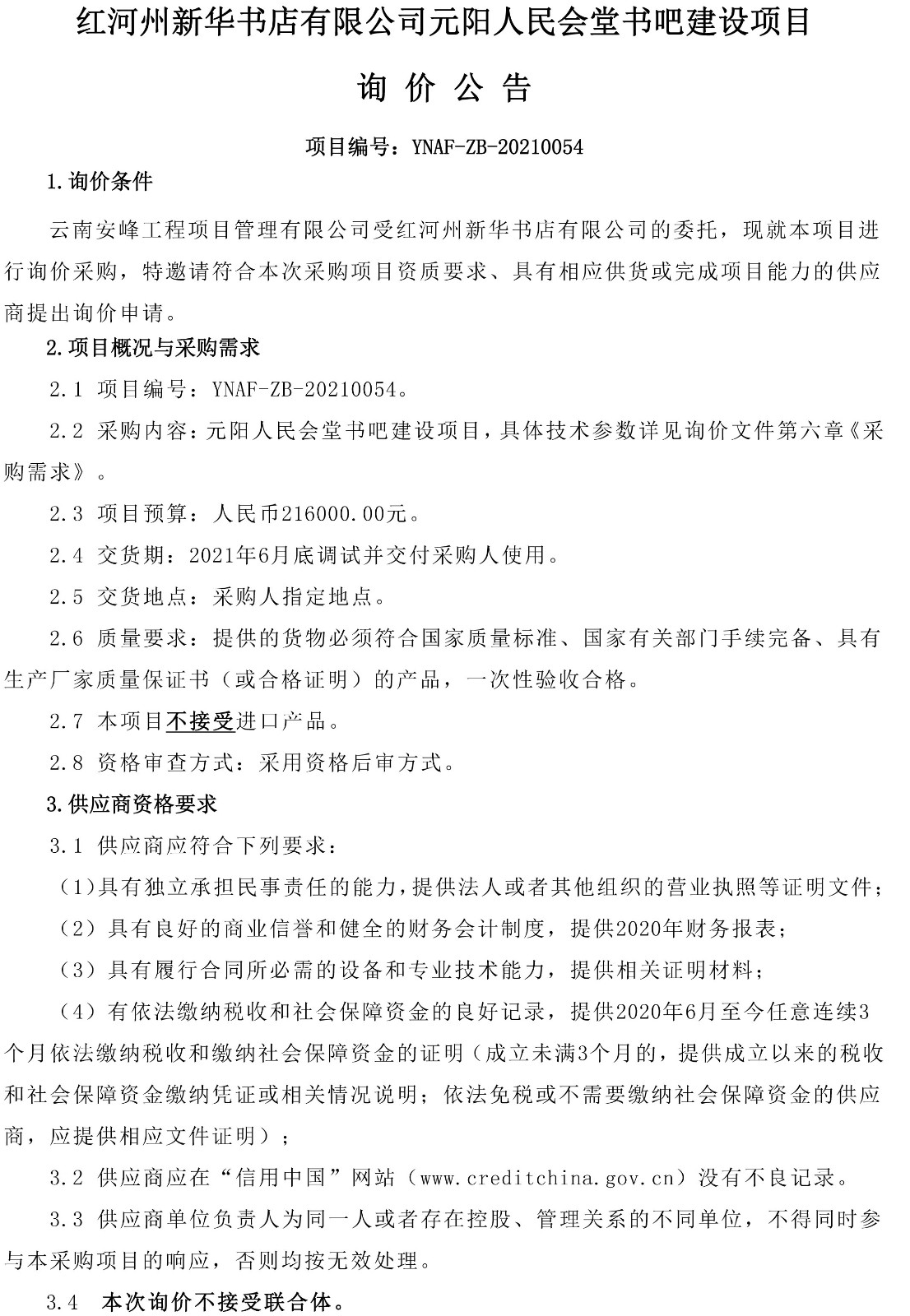 紅河州新華書店有限公司元陽(yáng)人民會(huì)堂書吧建設(shè)項(xiàng)目詢價(jià)公告