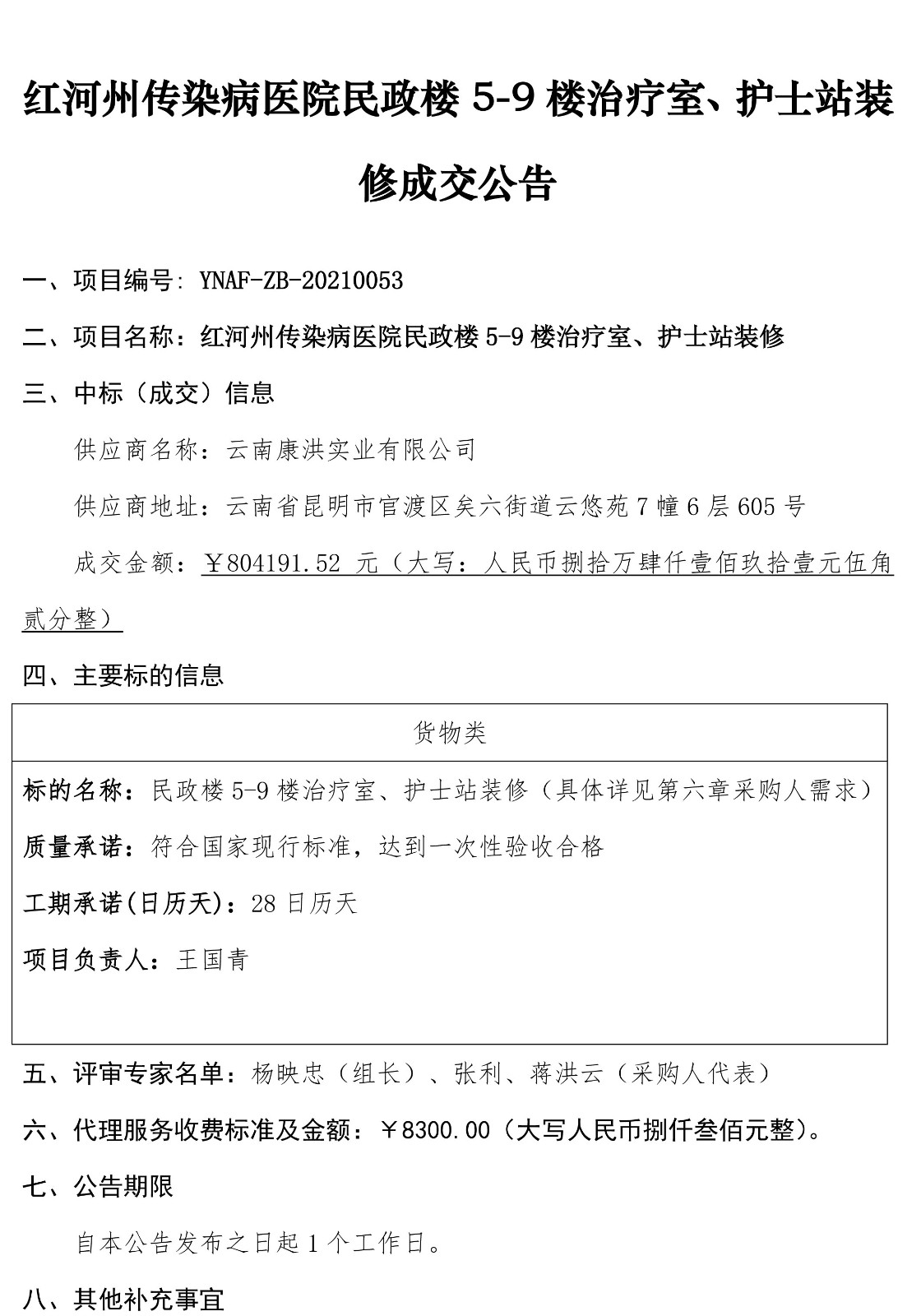 紅河州傳染病醫(yī)院民政樓5-9樓治療室、護士站裝修成交公告