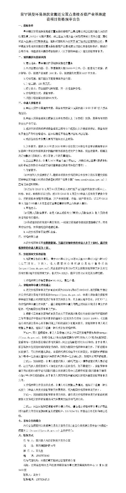 景罕鎮(zhèn)曼環(huán)易地扶貧搬遷安置點桑枝香菇產(chǎn)業(yè)基地建設(shè)項目資格預(yù)審公告