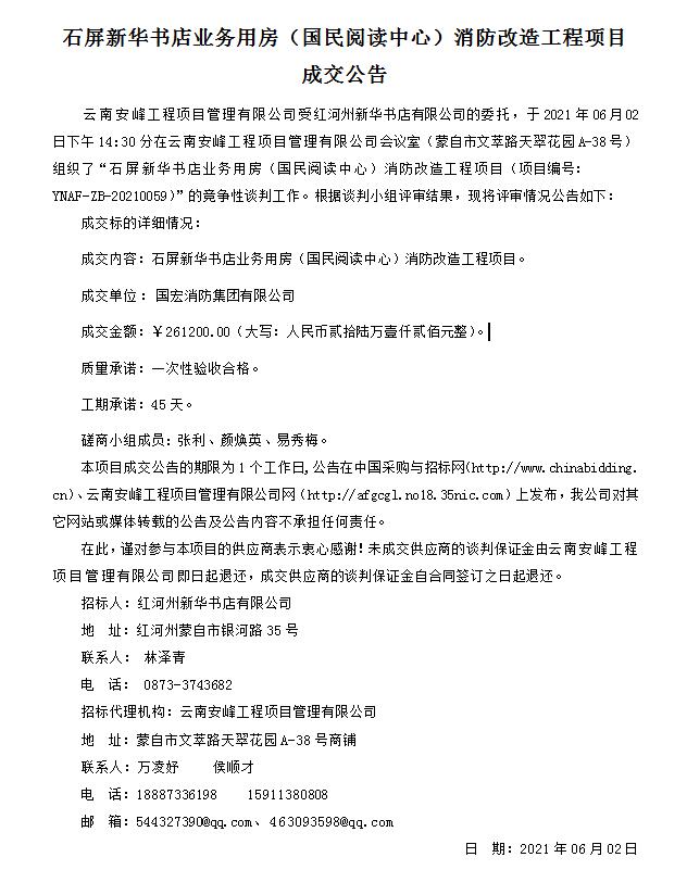 石屏新華書店業(yè)務(wù)用房(國(guó)民閱讀中心)消防改造工程項(xiàng)目成交公告