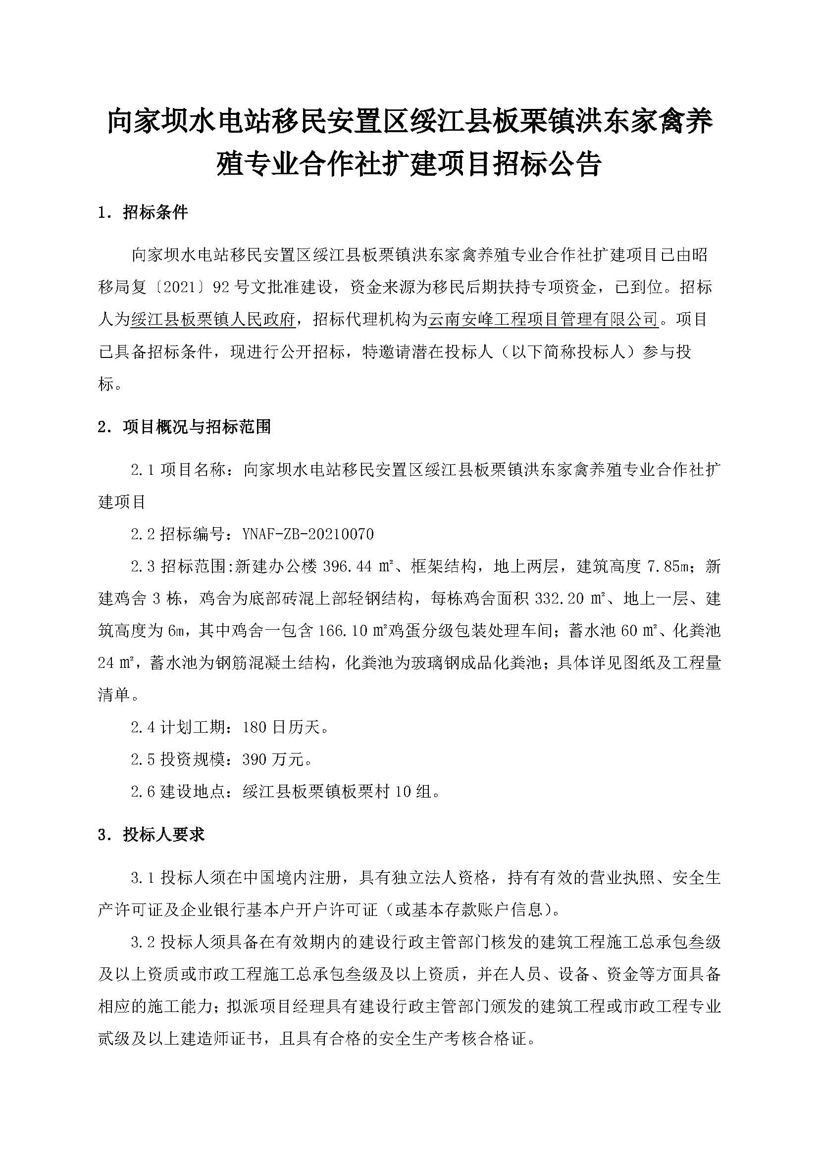 向家壩水電站移民安置區(qū)綏江縣板栗鎮(zhèn)洪東家禽養(yǎng)殖專業(yè)合作社擴建項目招標公告