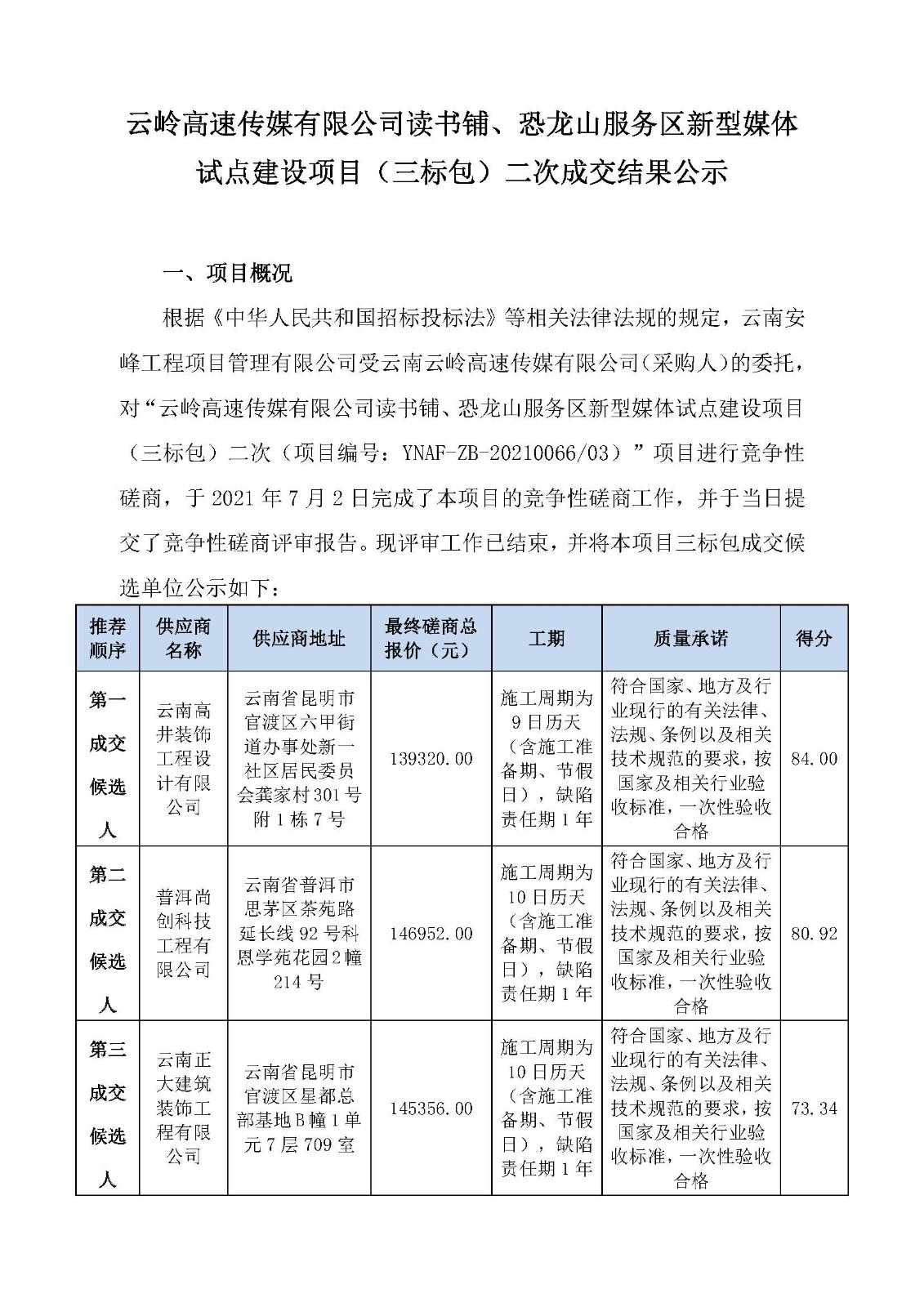 云嶺高速傳媒有限公司讀書鋪、恐龍山服務(wù)區(qū)新型媒體試點(diǎn)建設(shè)項(xiàng)目(三標(biāo)包)二次成交結(jié)果公示