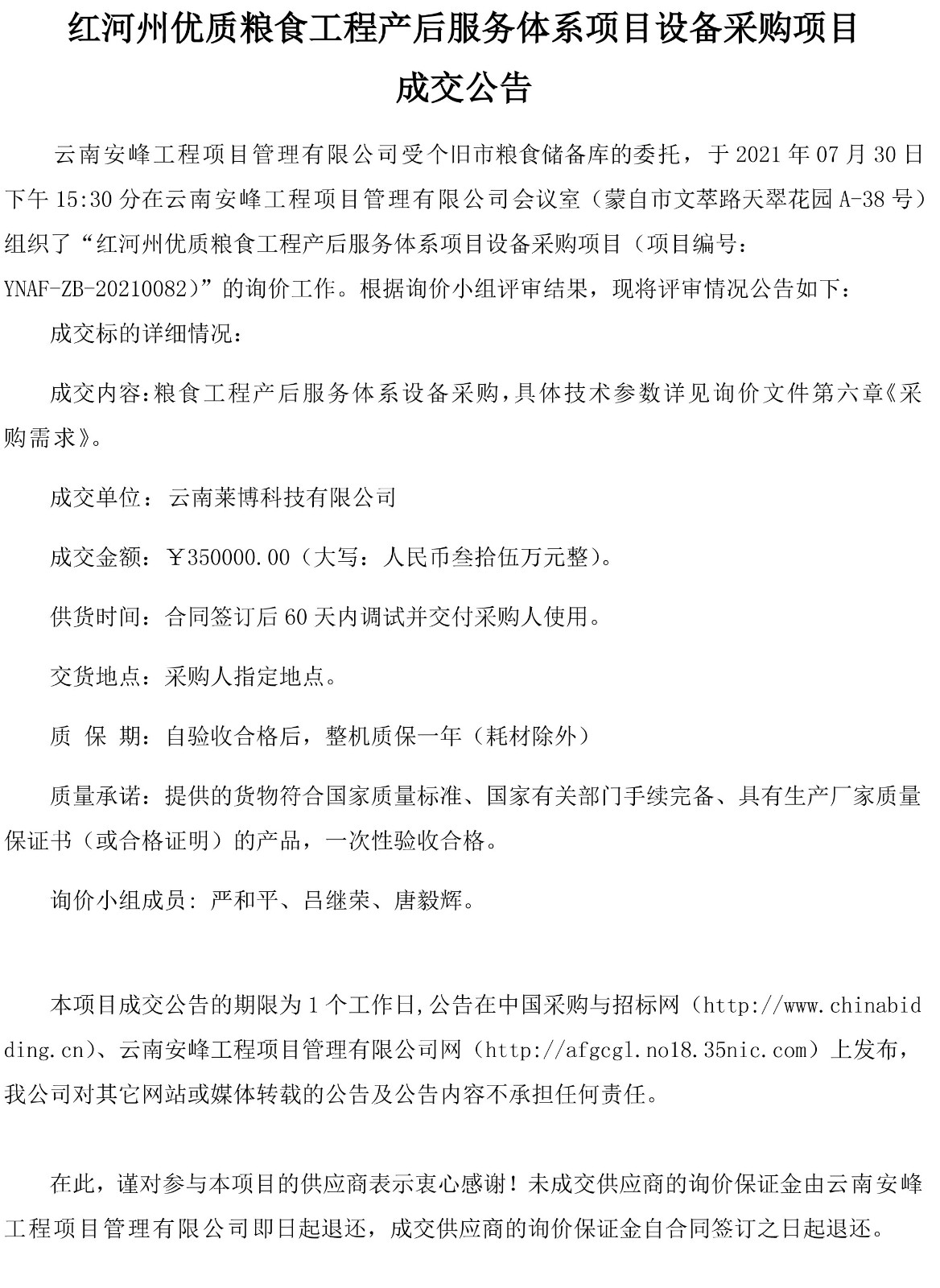紅河州優(yōu)質(zhì)糧食工程產(chǎn)后服務(wù)體系項(xiàng)目設(shè)備采購項(xiàng)目成交公告