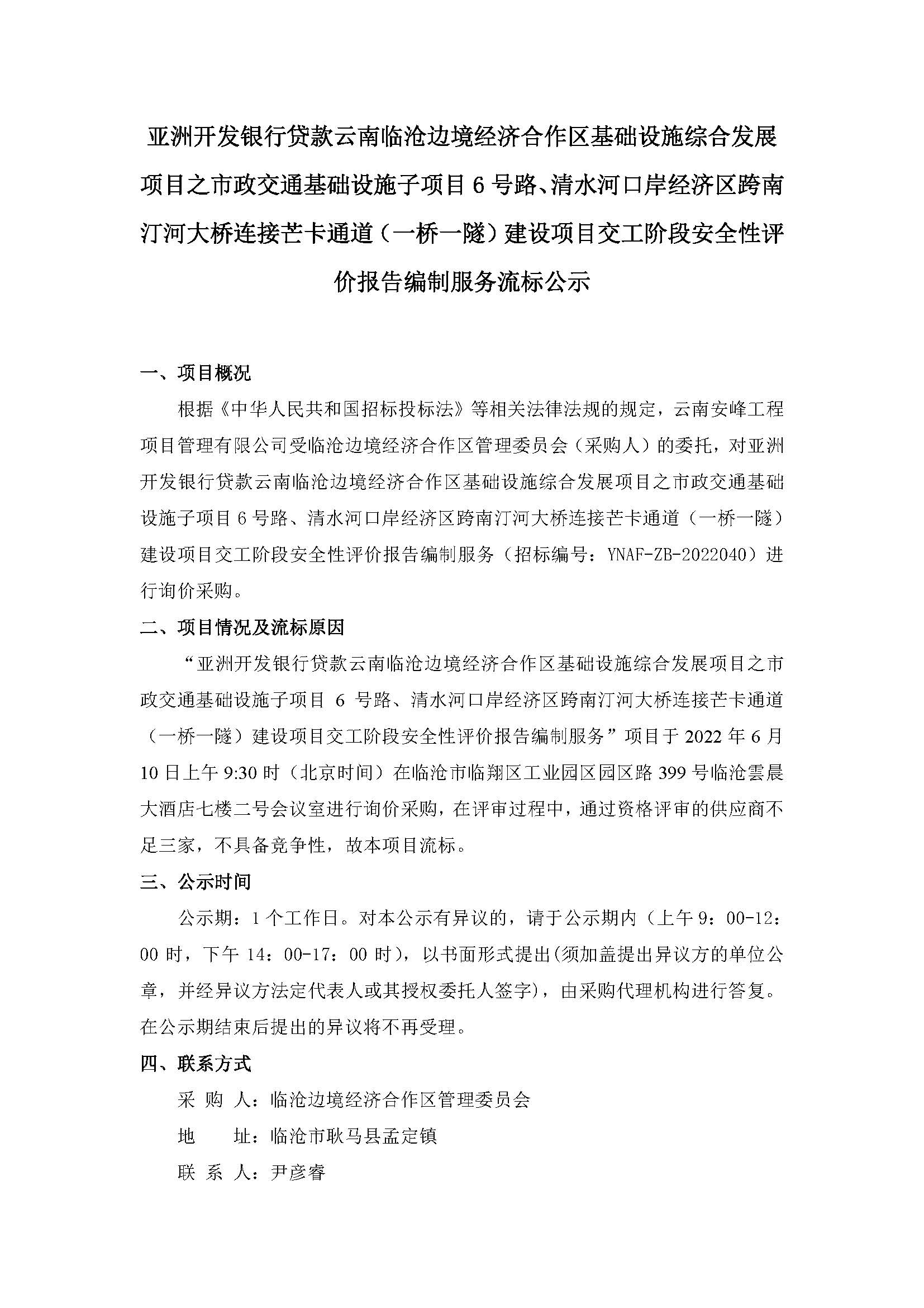 亞洲開發(fā)銀行貸款云南臨滄邊境經(jīng)濟(jì)合作區(qū)基礎(chǔ)設(shè)施綜合發(fā)展項(xiàng)目之市政交通基礎(chǔ)設(shè)施子項(xiàng)目6號(hào)路、清水河口岸經(jīng)濟(jì)區(qū)跨南汀河大橋連接芒卡通道(一橋一隧)建設(shè)項(xiàng)目交工階段安全性評(píng)價(jià)報(bào)告編制服務(wù)