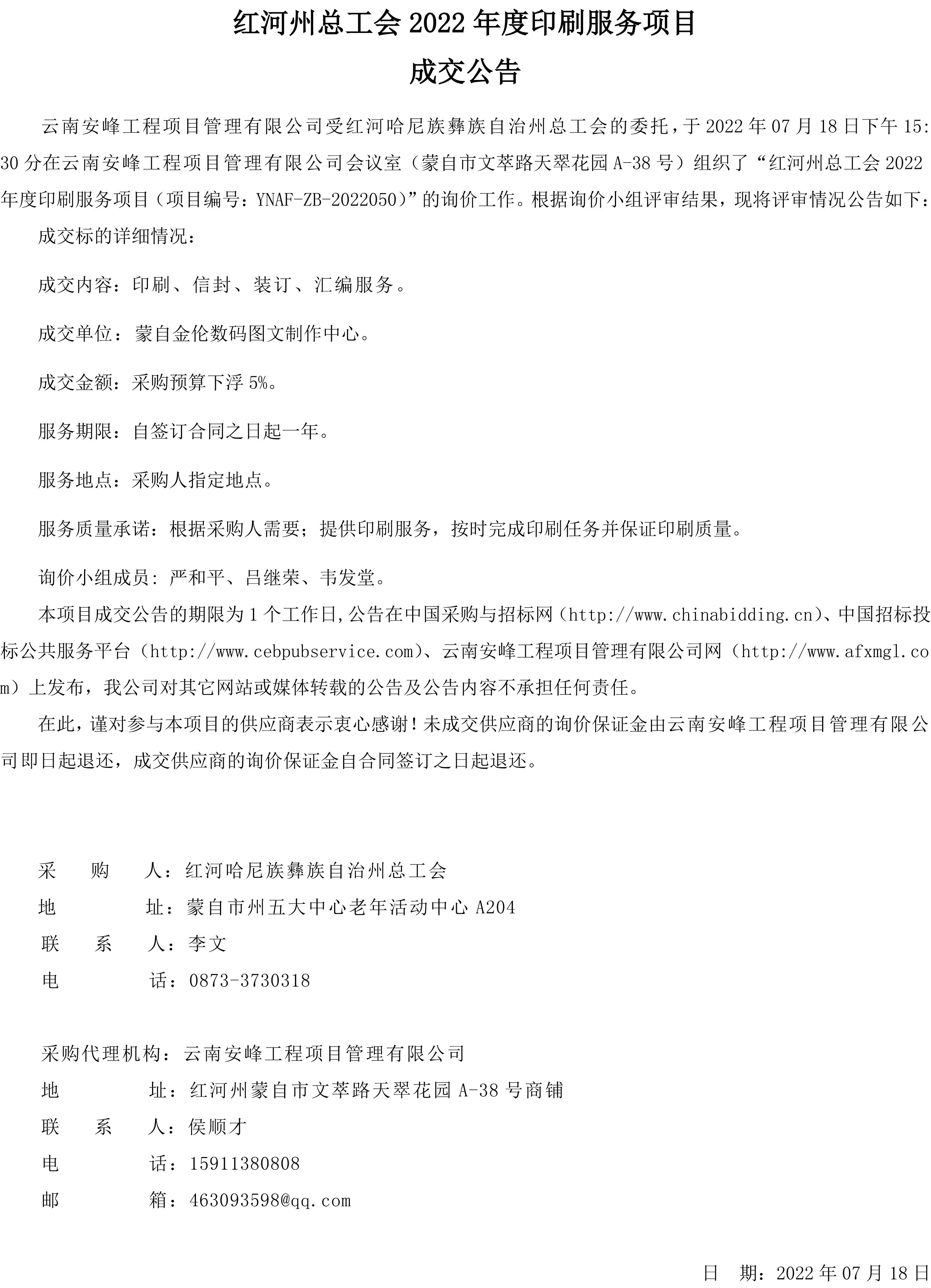 紅河州總工會2022年度印刷服務(wù)項目成交公告
