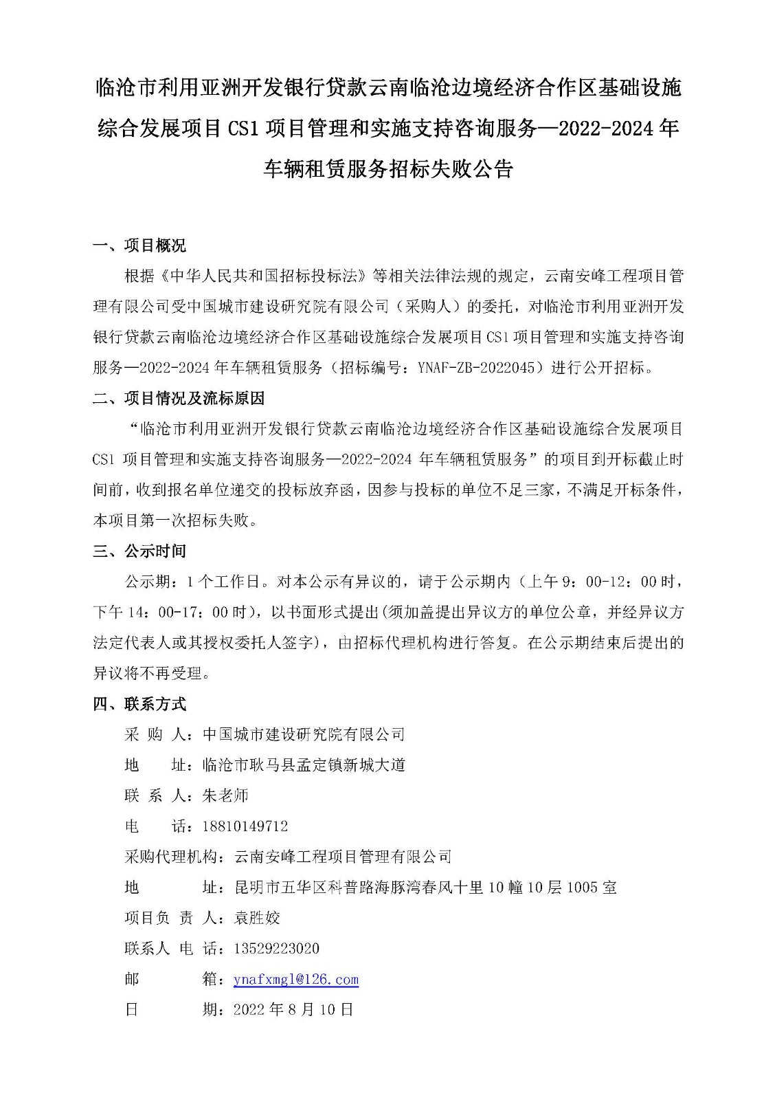 臨滄市利用亞洲開發(fā)銀行貸款云南臨滄邊境經(jīng)濟(jì)合作區(qū)基礎(chǔ)設(shè)施綜合發(fā)展項(xiàng)目CS1項(xiàng)目管理和實(shí)施支持咨詢服務(wù)—2022-2024年車輛租賃服務(wù)招標(biāo)失敗公告