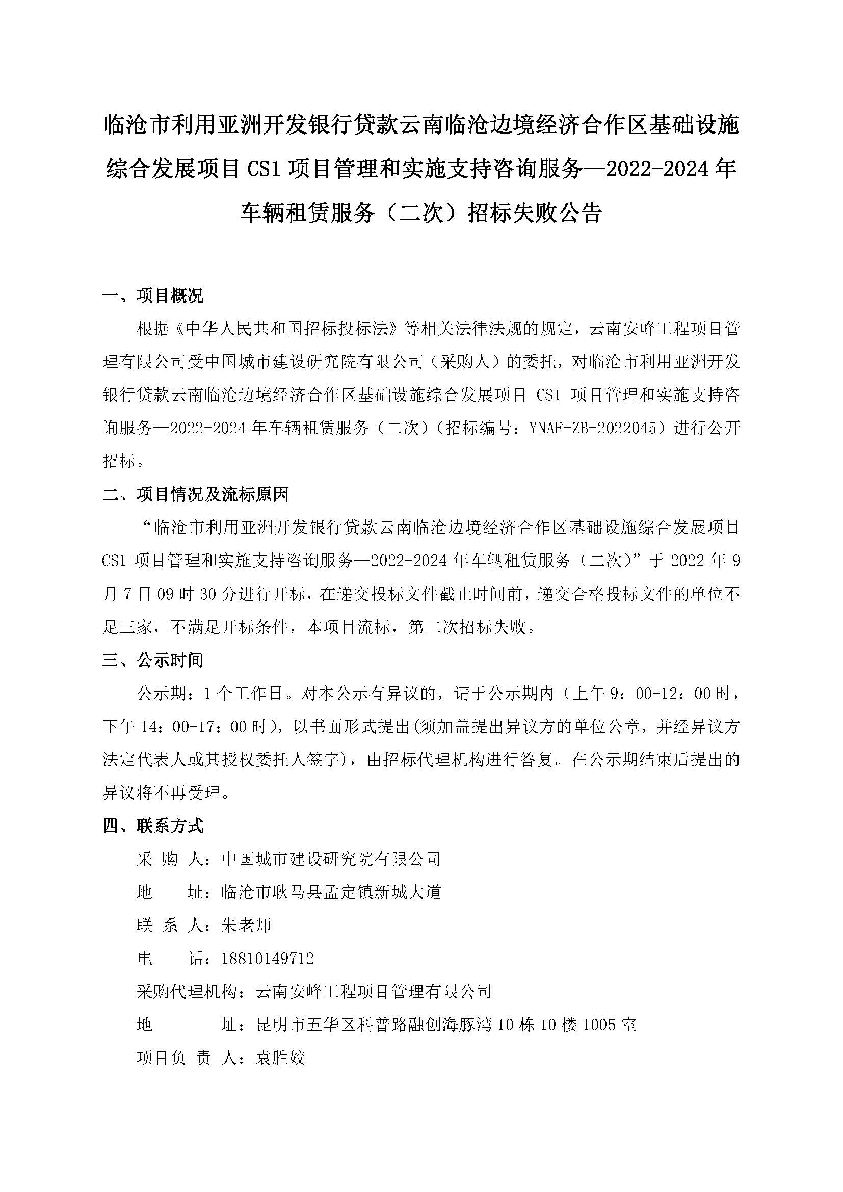 臨滄市利用亞洲開發(fā)銀行貸款云南臨滄邊境經(jīng)濟(jì)合作區(qū)基礎(chǔ)設(shè)施綜合發(fā)展項(xiàng)目CS1項(xiàng)目管理和實(shí)施支持咨詢服務(wù)—2022-2024年車輛租賃服務(wù)招標(biāo)失敗公告