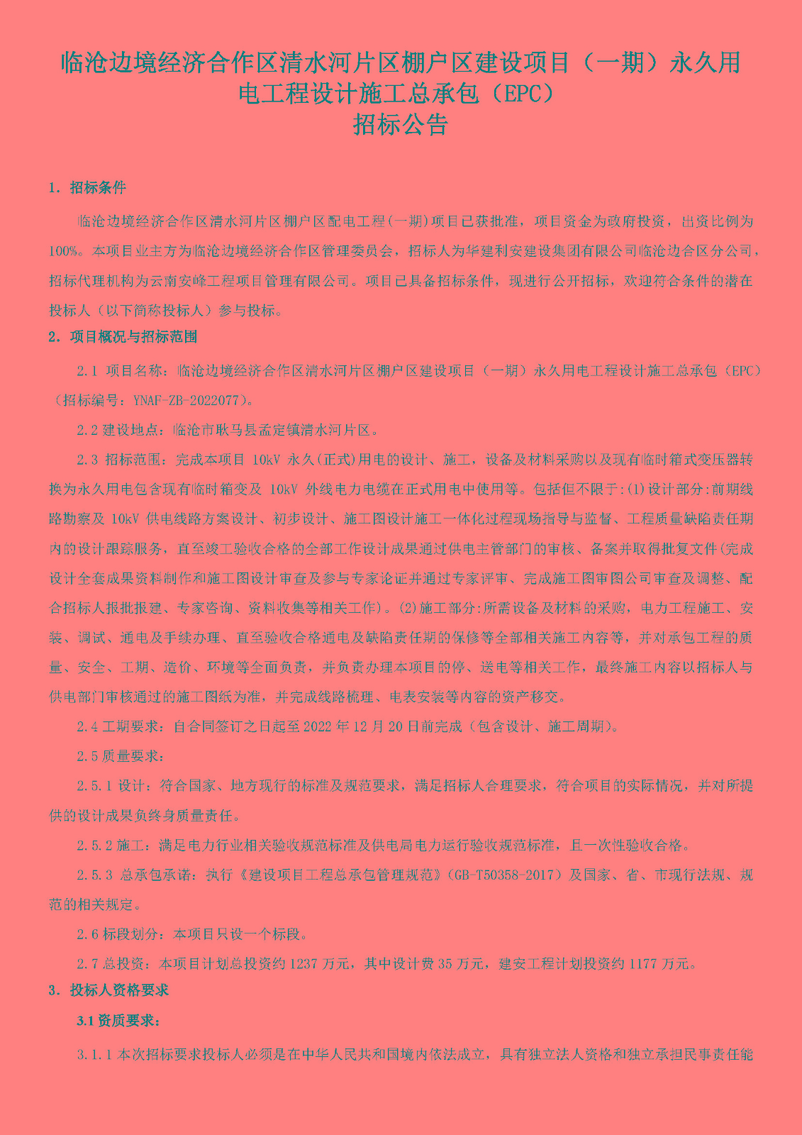 臨滄邊境經(jīng)濟合作區(qū)清水河片區(qū)棚戶區(qū)建設(shè)項目(一期)永久用電工程設(shè)計施工總承包(EPC)
