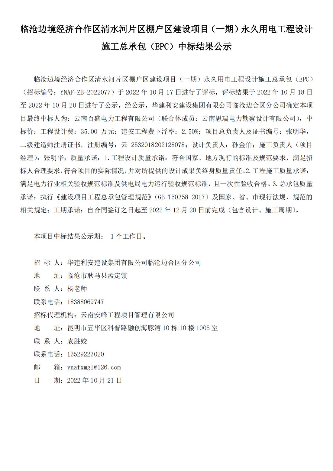 臨滄邊境經(jīng)濟合作區(qū)清水河片區(qū)棚戶區(qū)建設項目(一期)永久用電工程設計施工總承包(EPC)中標結果公示