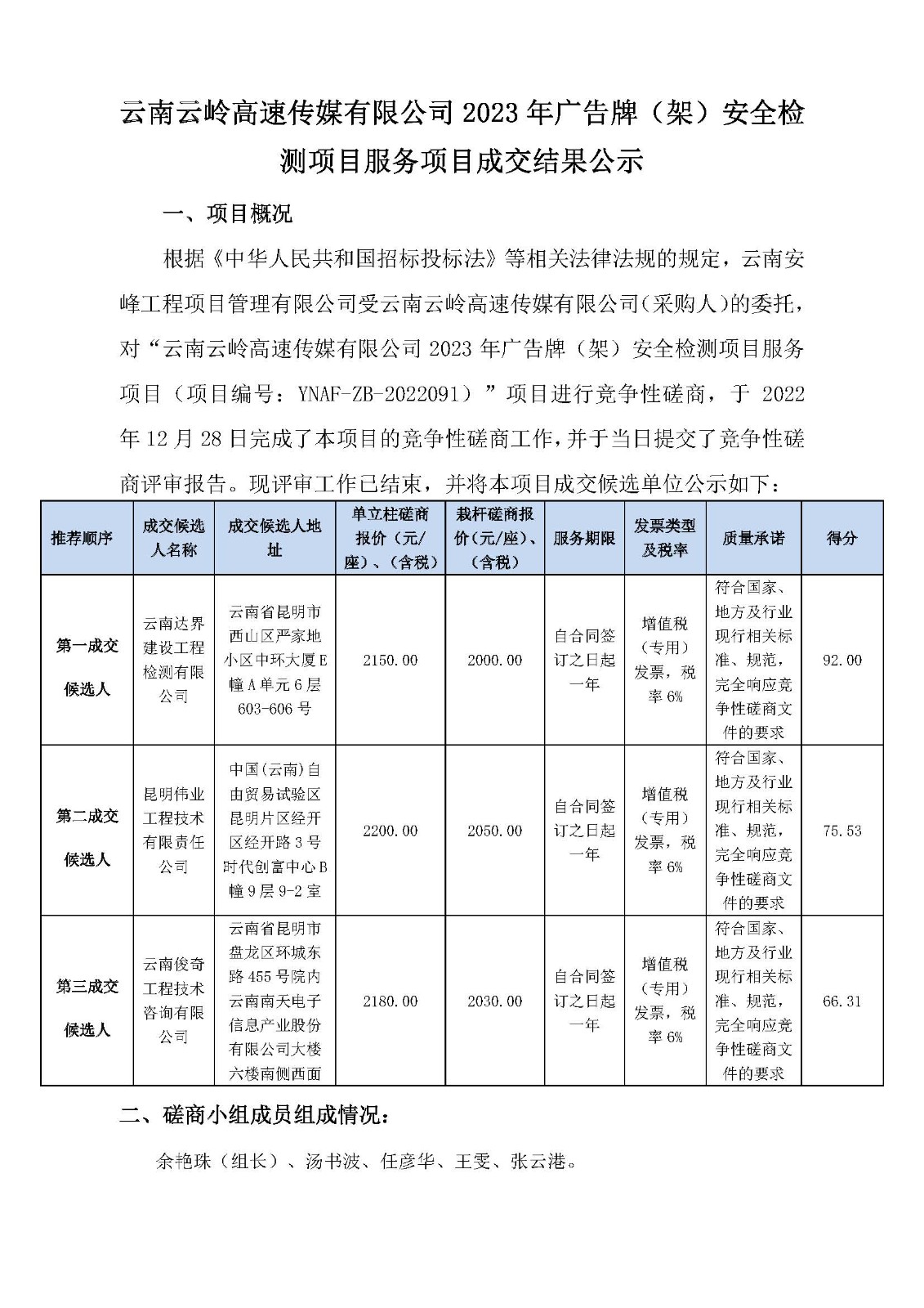 云南云嶺高速傳媒有限公司2023年廣告牌(架)安全檢測項目服務(wù)項目成交結(jié)果公示