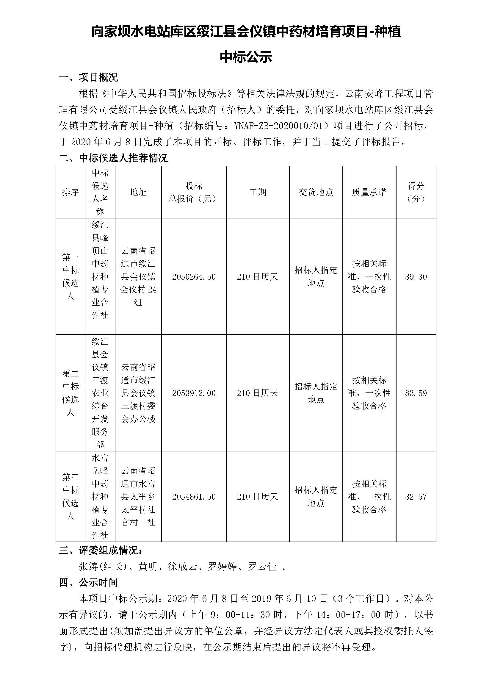 向家壩水電站庫區(qū)綏江縣會儀鎮(zhèn)中藥材培育項目-種植 中標公示