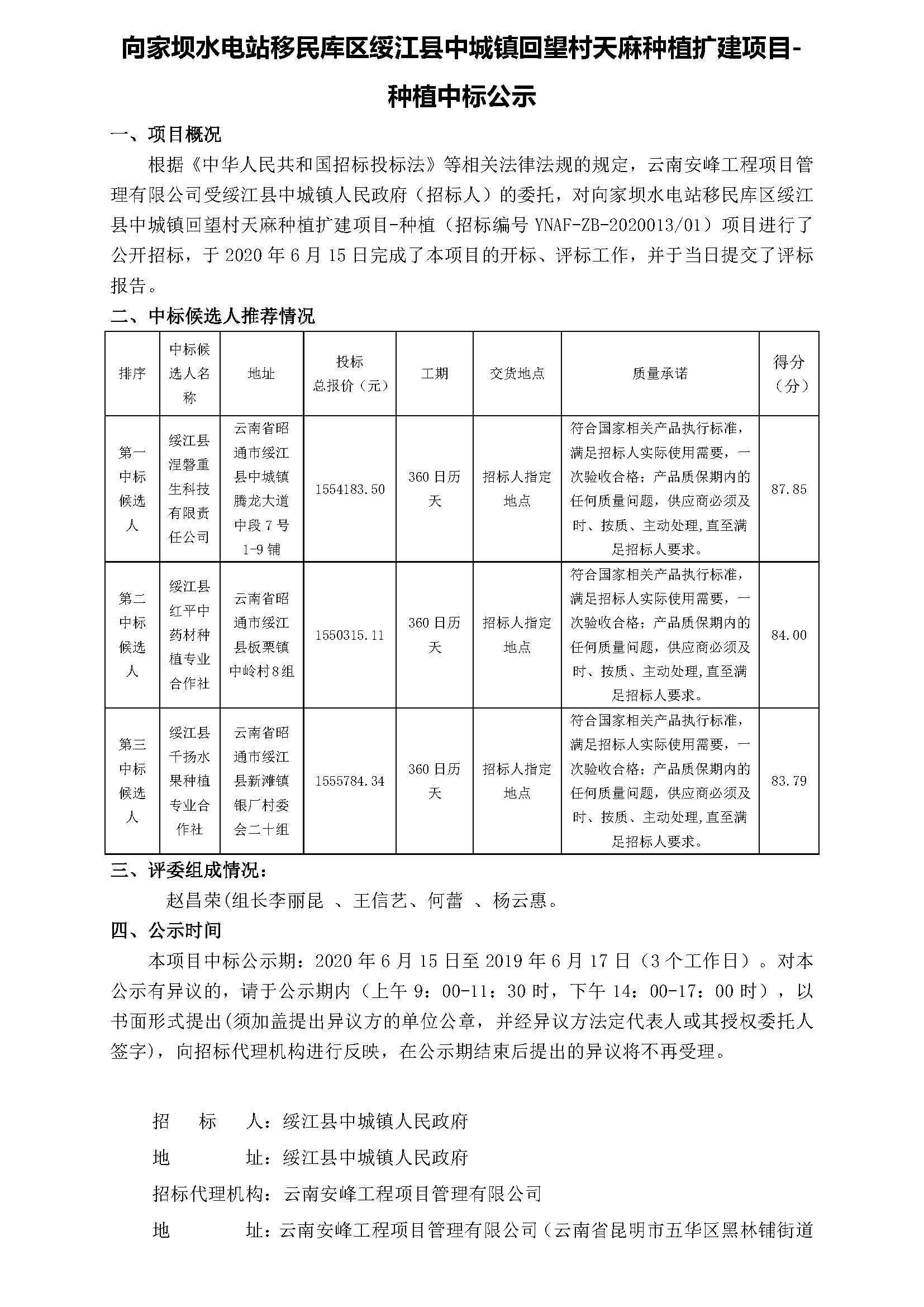 向家壩水電站移民庫區(qū)綏江縣中城鎮(zhèn)回望村天麻種植擴建項目-種植中標公示