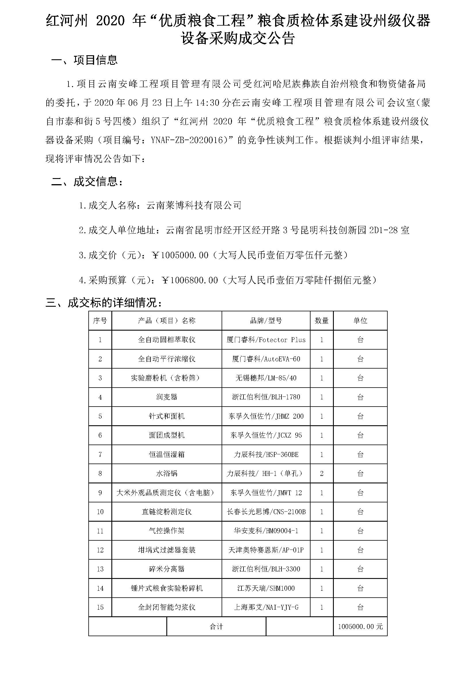 紅河州 2020 年“優(yōu)質(zhì)糧食工程”糧食質(zhì)檢體系建設(shè)州級(jí)儀器設(shè)備采購成交公告