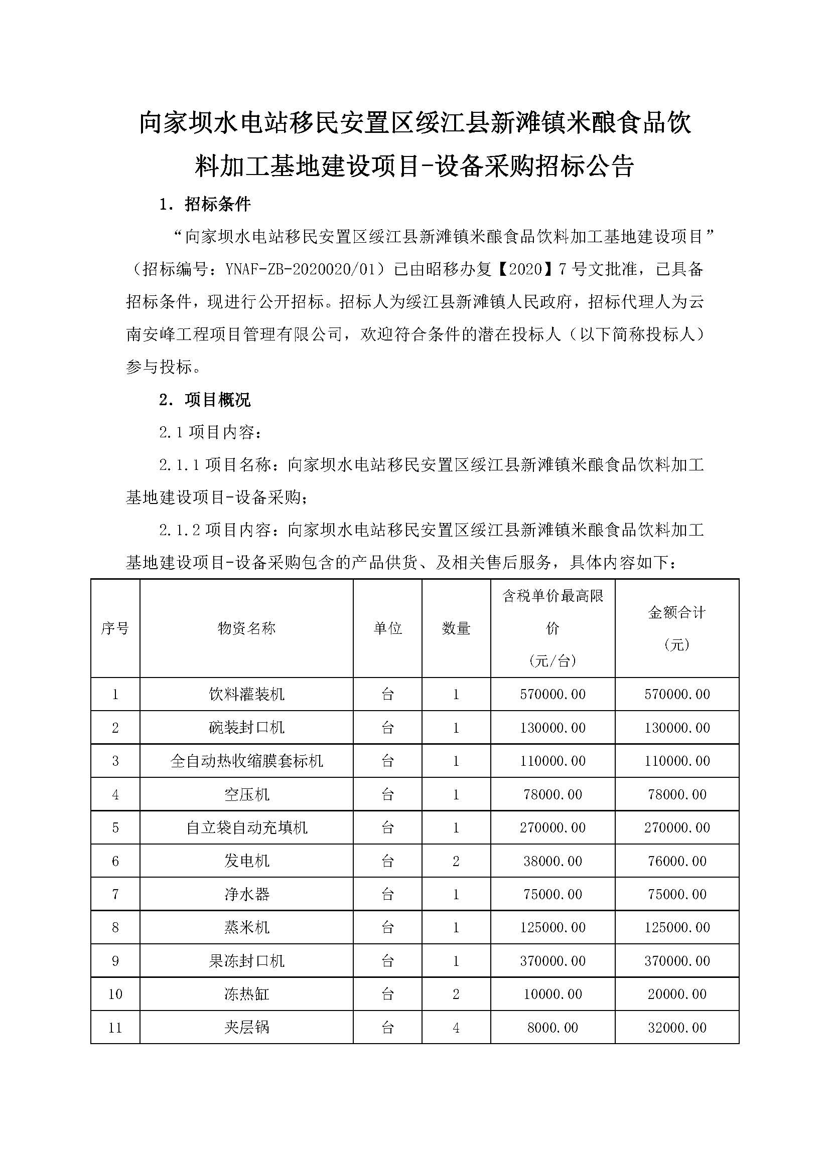 向家壩水電站移民安置區(qū)綏江縣新灘鎮(zhèn)米釀食品飲料加工基地建設(shè)項目-設(shè)備采購招標(biāo)公告
