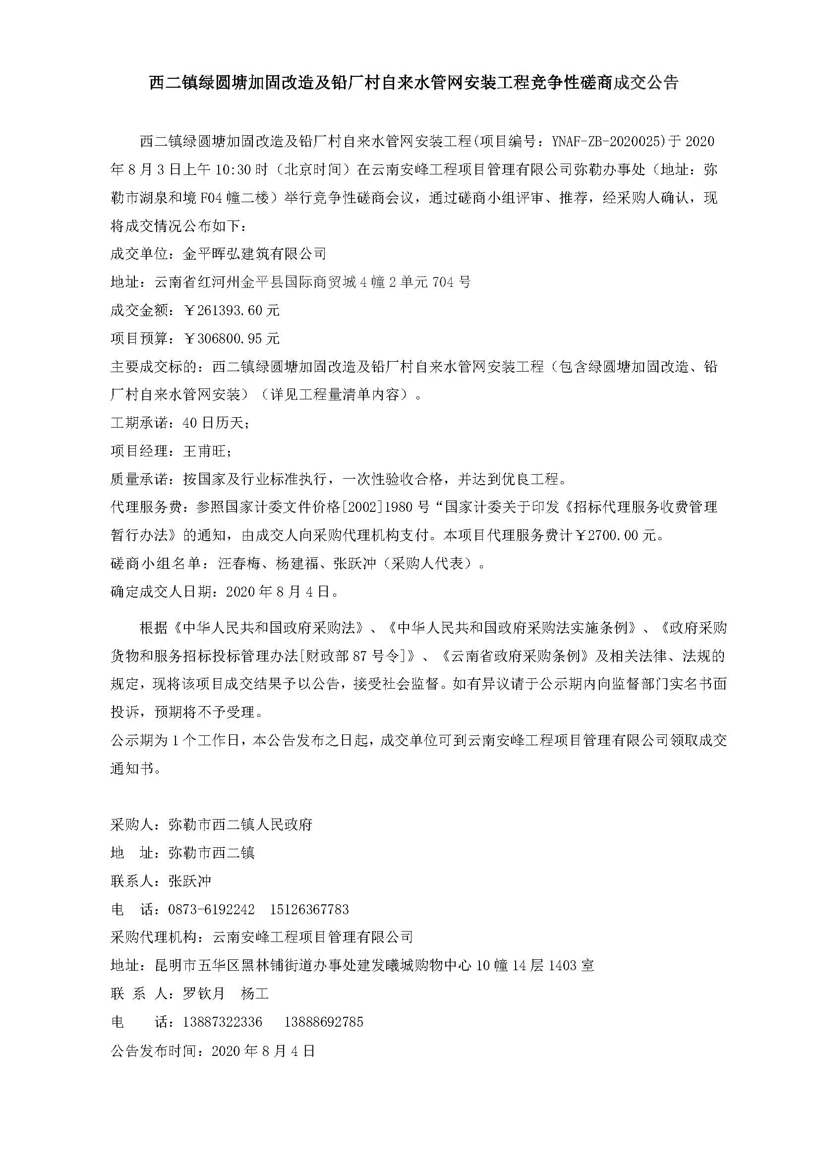 西二鎮(zhèn)綠圓塘加固改造及鉛廠村自來水管網(wǎng)安裝工程競爭性磋商成交公告