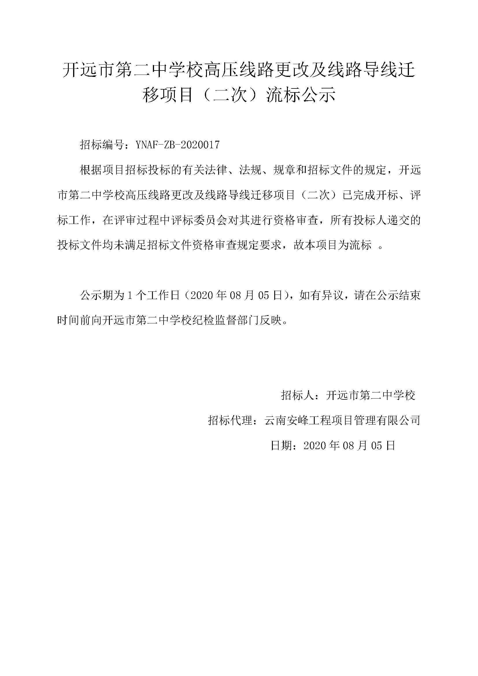 開(kāi)遠(yuǎn)市第二中學(xué)校高壓線路更改及線路導(dǎo)線遷移項(xiàng)目(二次)流標(biāo)公示