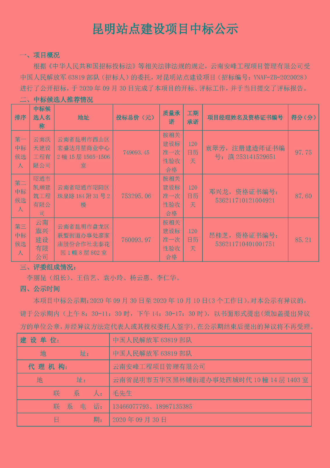 昆明站點(diǎn)建設(shè)項(xiàng)目中標(biāo)公示