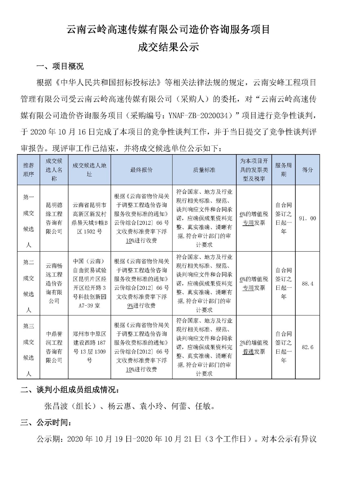云南云嶺高速傳媒有限公司造價咨詢服務(wù)項目 成交結(jié)果公示