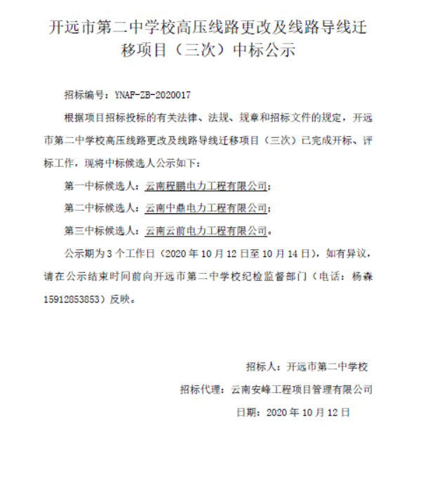 開遠(yuǎn)市第二中學(xué)校高壓線路更改及線路導(dǎo)線遷移項(xiàng)目(三次)中標(biāo)公示