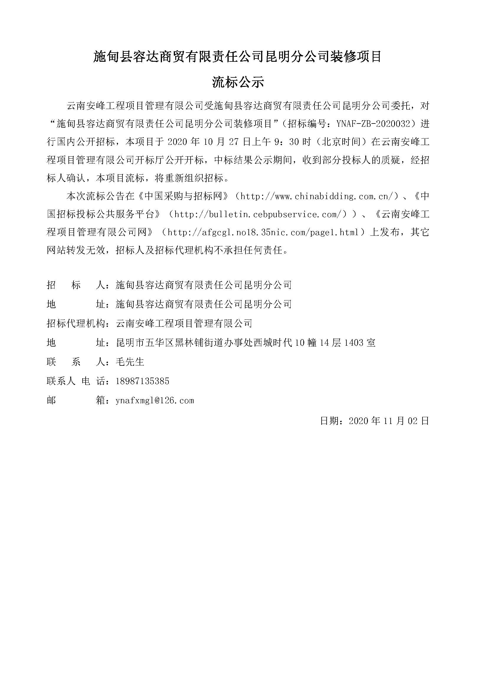 施甸縣容達商貿有限責任公司昆明分公司裝修項目流標公示