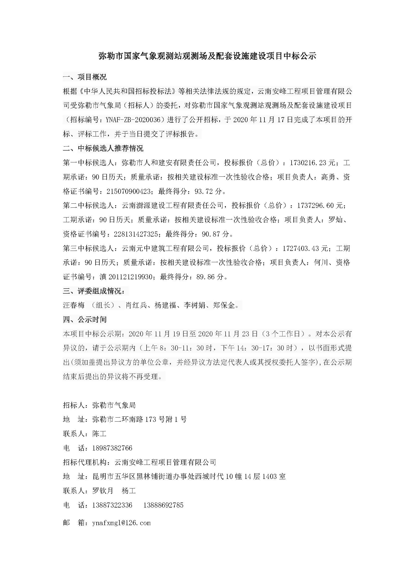 彌勒市國(guó)家氣象觀測(cè)站觀測(cè)場(chǎng)及配套設(shè)施建設(shè)項(xiàng)目中標(biāo)公示